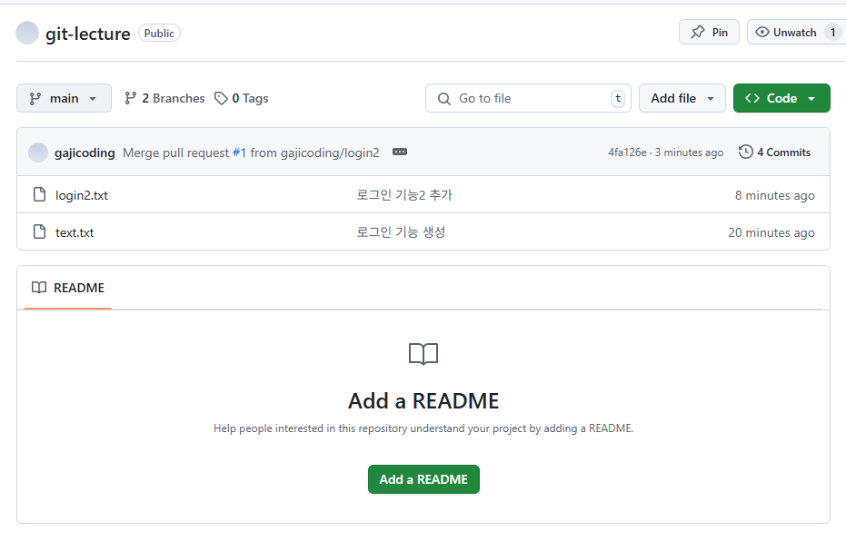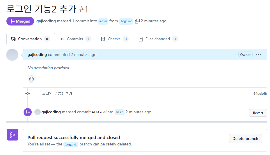 Github 에서 merge 한 내용을 확인할 수 있다.