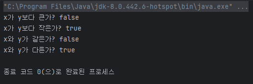 System.out.println("x와 y가 다른가? " + isNotEqual);