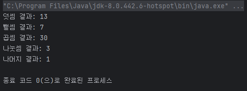 각각의 결과를 변수에 저장하고 출력하는 프로그램을 작성하세요.