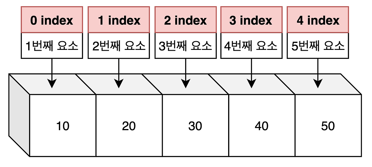 int[] arr = {10, 20, 30, 40, 50}; // 5개의 길이를 가진 배열