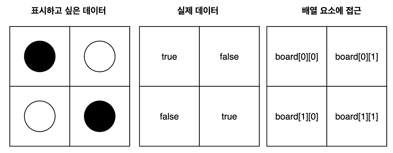 (3) 2차원 배열에서 검은돌(true)의 좌표(x, y) 찾기