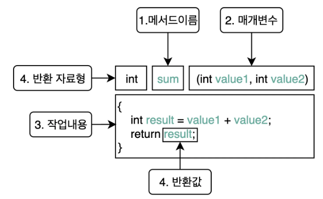 - 메서드가 실행할 명령문을 {} 중괄호 안에 작성한다.