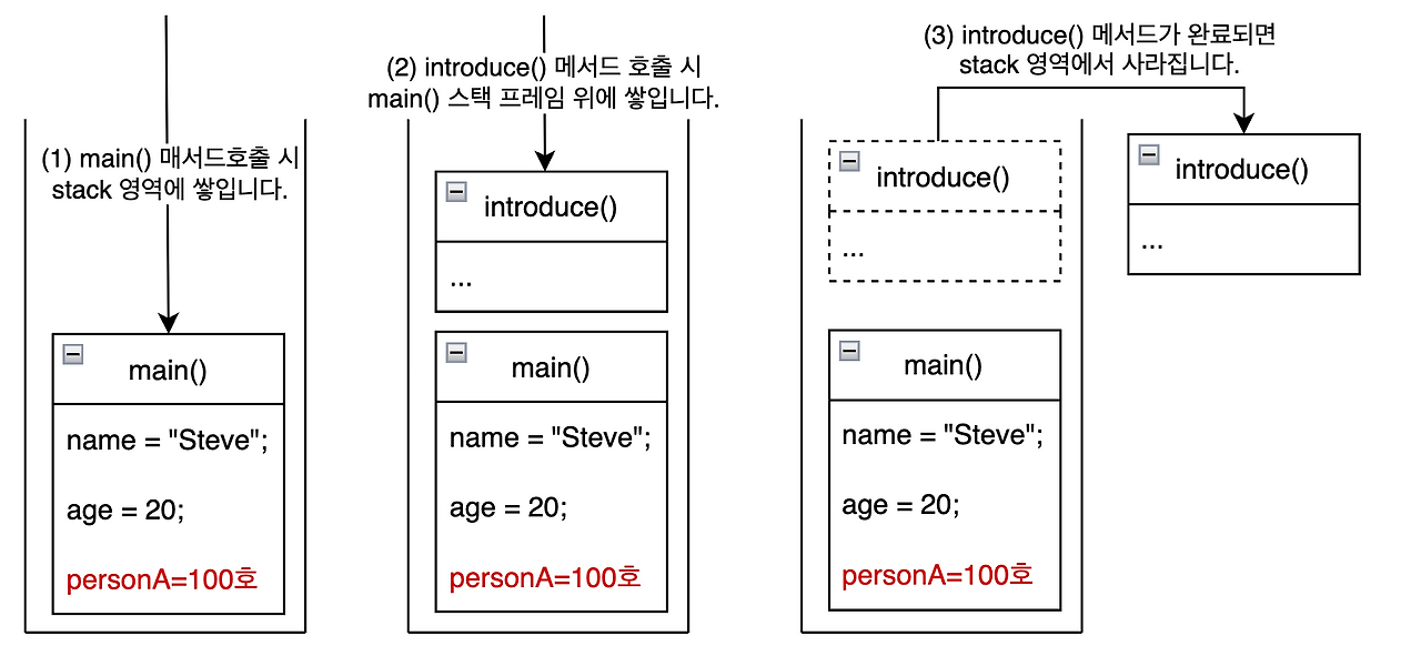 - 메서드가 호출될 때마다 Stack 영역에 메모리가 할당된다.