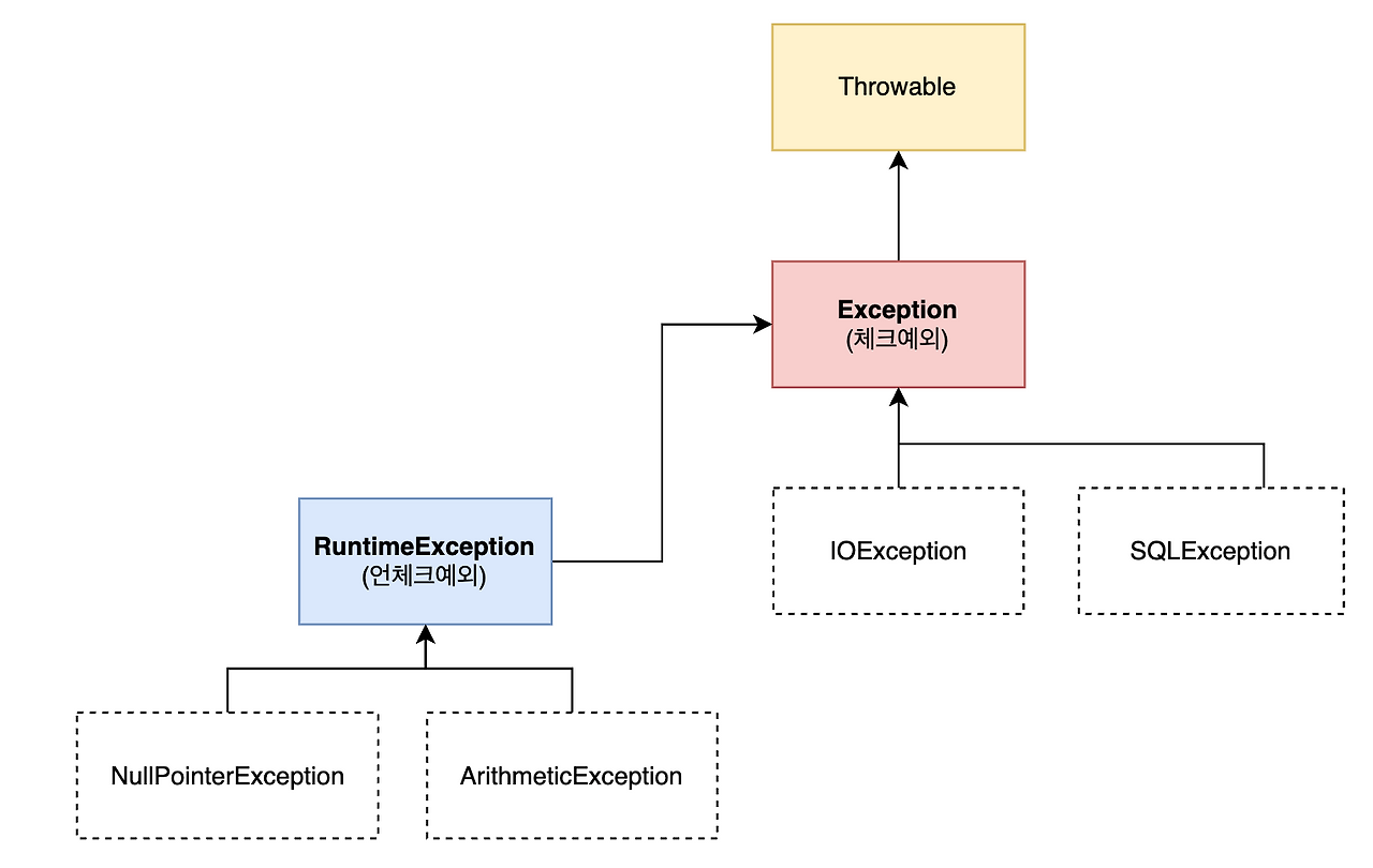 - 컴파일러가 예외 처리를 강제하지 않는 예외