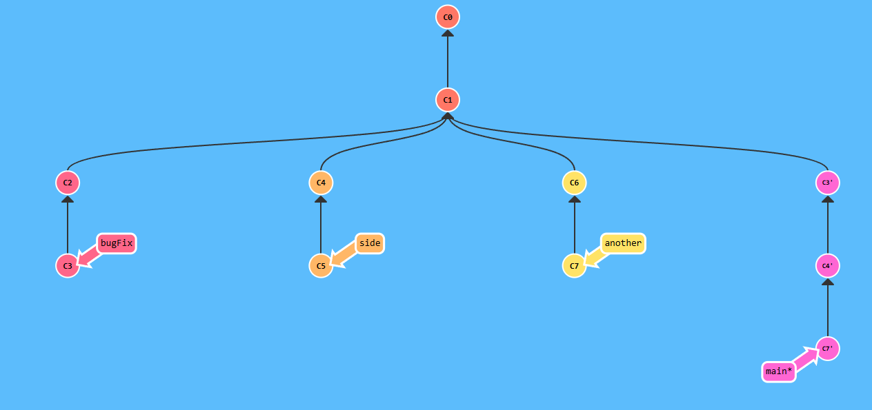 우리는 C2와 C4 커밋을 원했고 git이 우리가 원하는 곳 바로 밑에 톡 떨어뜨려 줬습니다. 아주 간단하죠!