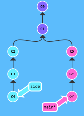 main 으로 복사하고 싶은 작업이 있는 브랜치 side가 있습니다. 이것은 rebase를 통해서 할 수 있습니다, 하지만 체리-픽이 이 작업을 어떻게 수행하는지 확인해 봅시다.