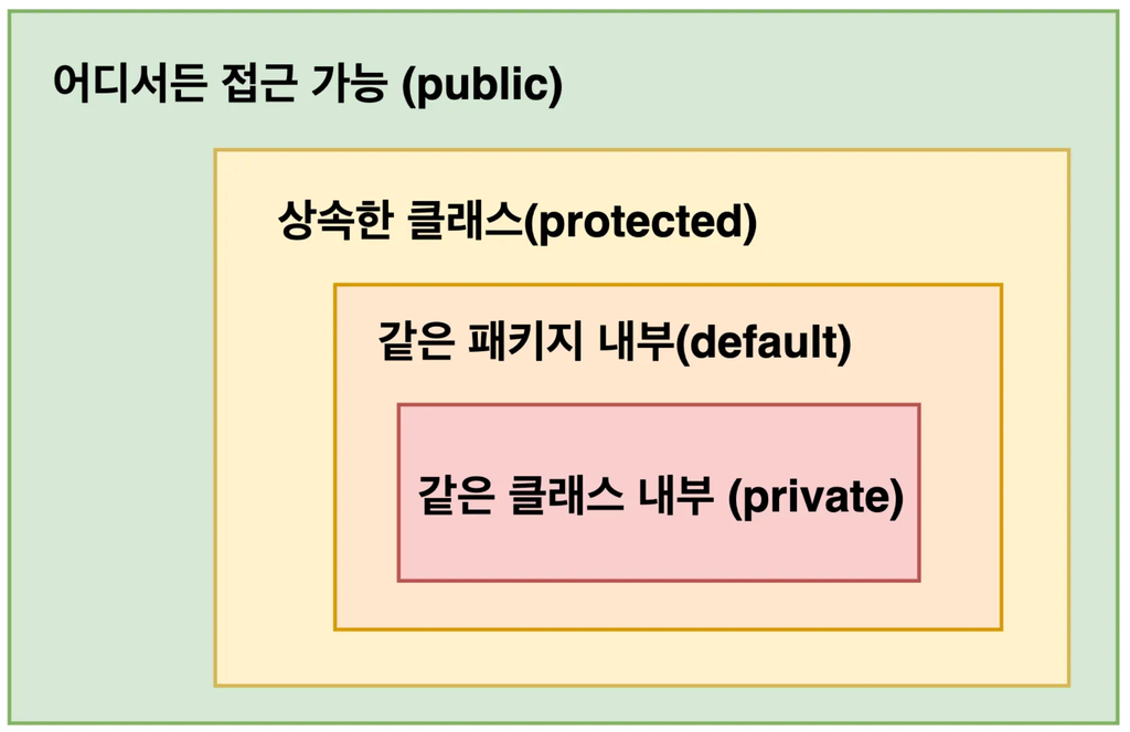 | 접근제어자 | 클래스 내부 | 패키지 내부 | 상속한 클래스 | 전체 공개 |