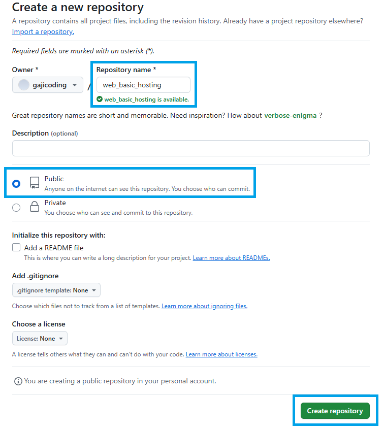 - Repository 이름 입력하고, Public(공개) 설정 후 Create repository 버튼 클릭