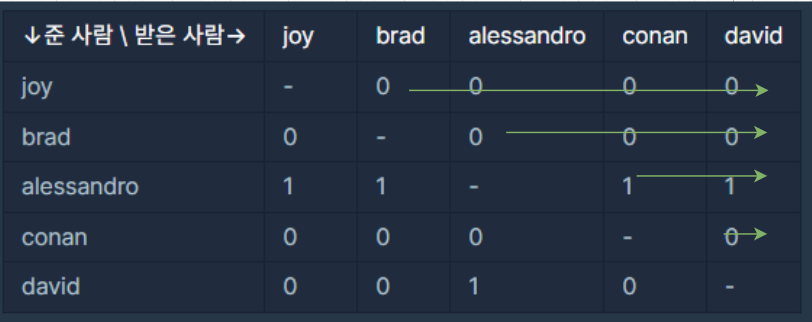 | ↓준 사람 \ 받은 사람→ | joy | brad | alessandro | conan | david |