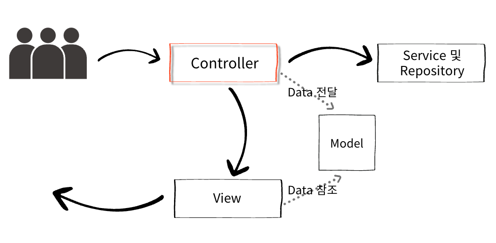 - Controller: 사용자의 요청을 처리하고, 적절한 Model과 View를 연결하는 중간 관리자 역할
