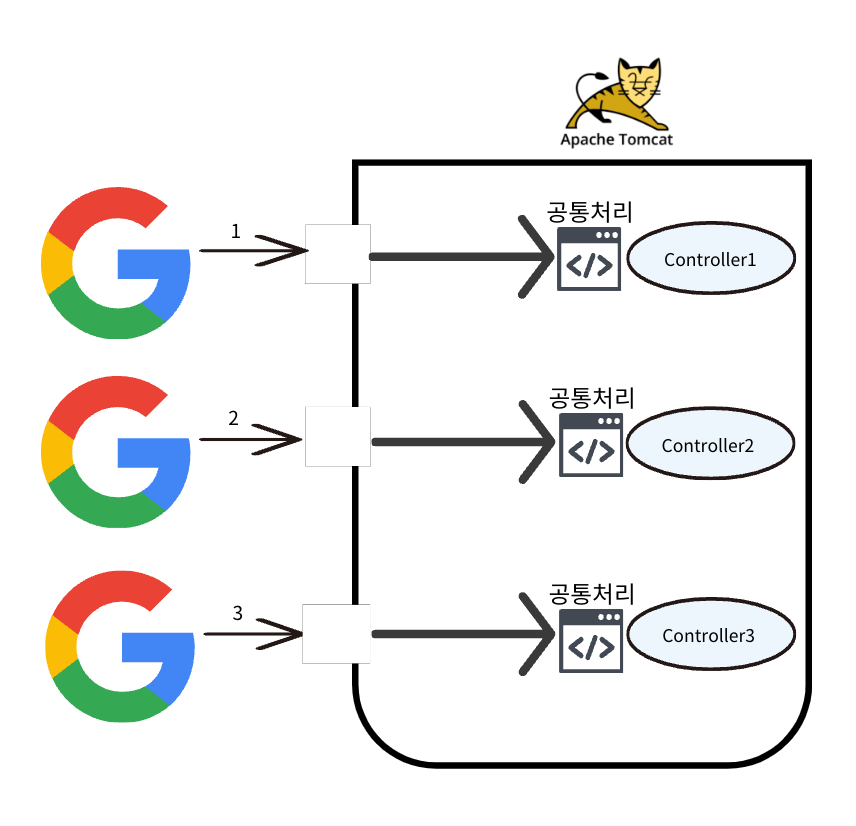 - 모든 요청을 단일 진입점인 하나의 Servlet(프론트 컨트롤러)이 받아 공통 처리를 수행하고, 이후 해당 요청을 담당할 컨트롤러로 위임하는 구조