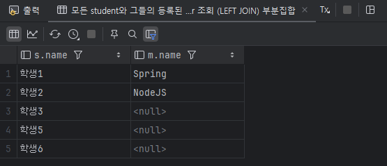 - LEFT JOIN은 왼쪽 테이블(student)의 모든 데이터를 반환하며, 오른쪽 테이블(enrollment, major)에 일치하는 데이터가 없으면 NULL을 반환한다.