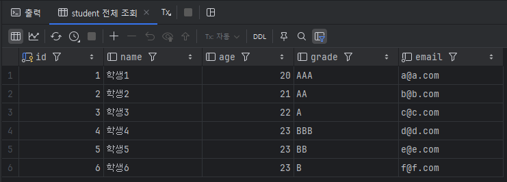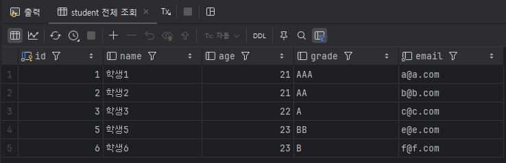 INSERT INTO student (name, age, grade, email) VALUES('학생6', 23, 'B', 'f@f.com');