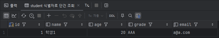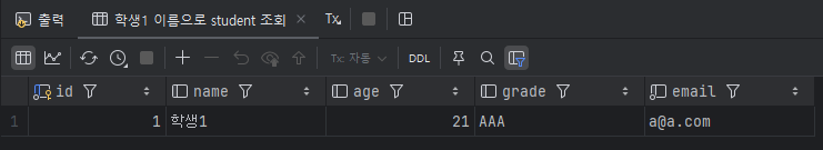INSERT INTO student (name, age, grade, email) VALUES('학생1', 20, 'AAA', 'a@a.com');