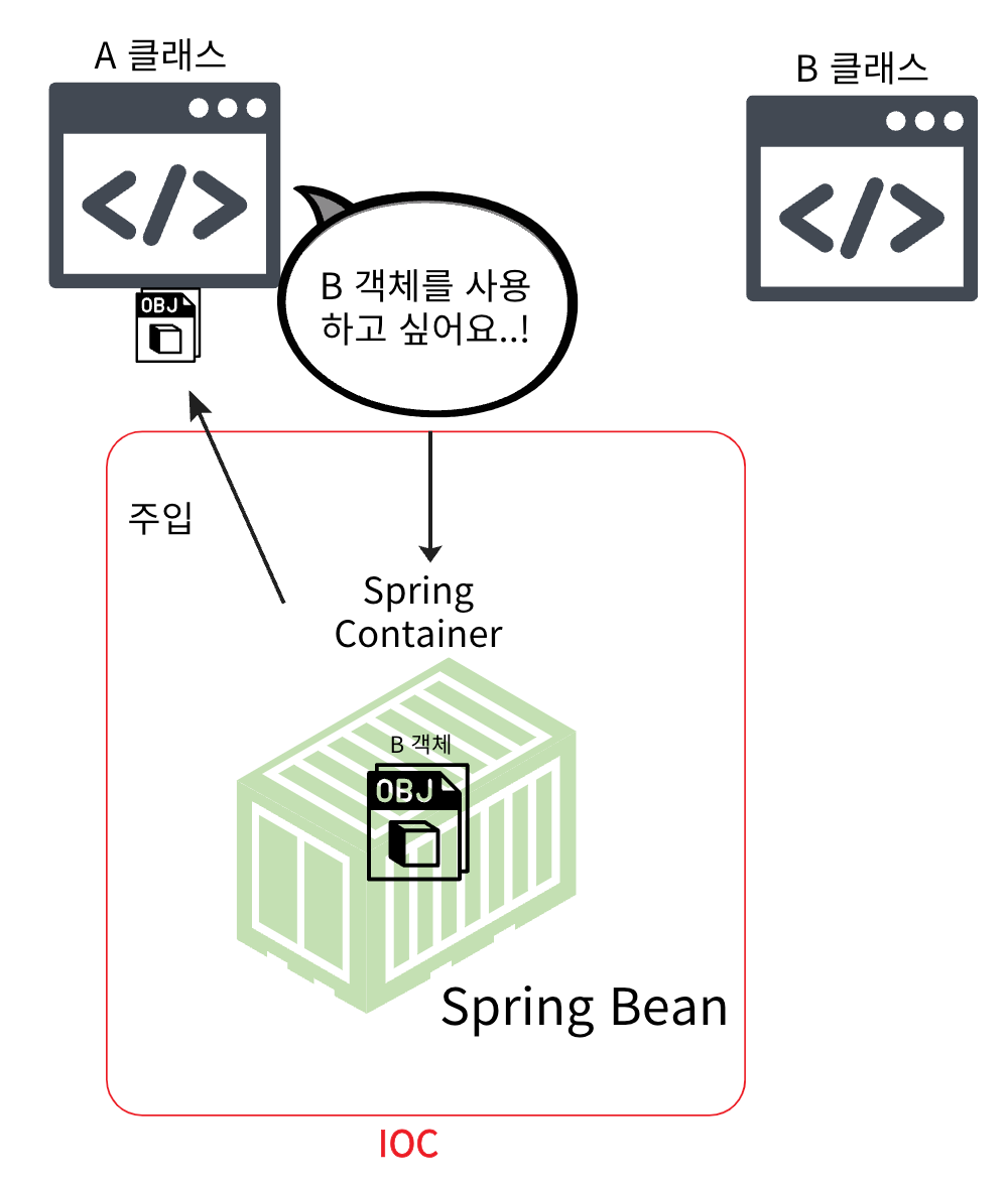 - 객체가 필요한 다른 객체를 스스로 생성하거나 관리하지 않고, 외부에서 주입하는 방식으로 의존성을 해결하는 방식