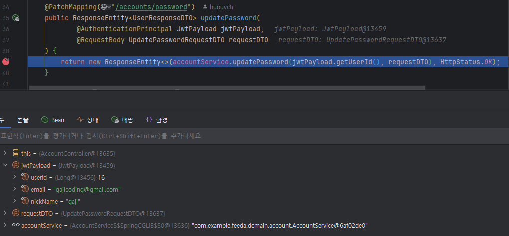 2. jwt 검증과 security 를 통과 후 컨트롤러에 도달한 것을 확인