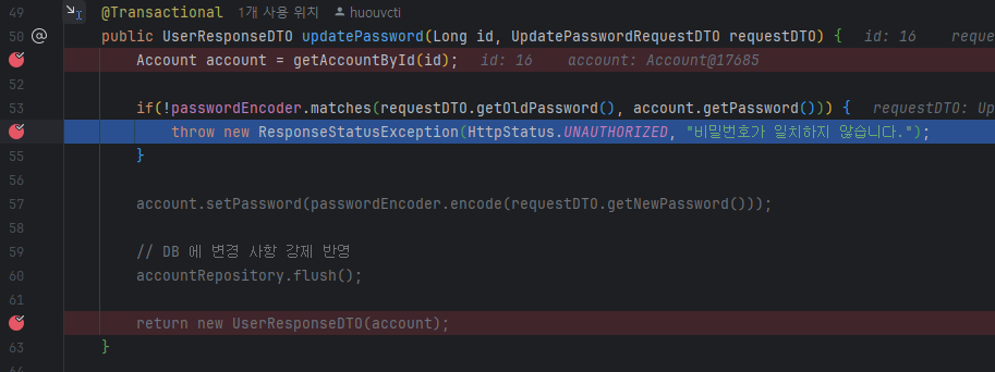 - 서비스의 비즈니스 로직에서 예외 발생 (비밀번호 오류 시 예외 처리)