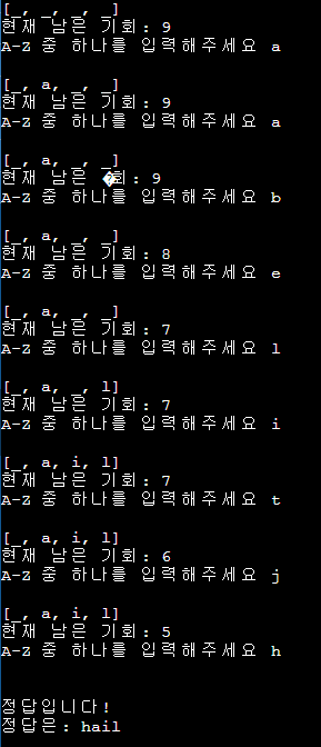 - 입력값이 정답에 포함된 알파벳일 경우 해당 알파벳이 들어간 자리를 전부 보여주고, 다시 입력을 받습니다.