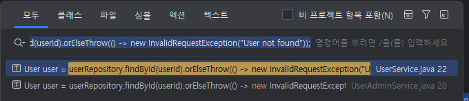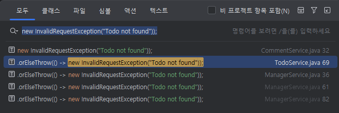 여러 서비스 클래스에서 동일한 형태의 예외 로직이 반복되고 있는 상황 확인