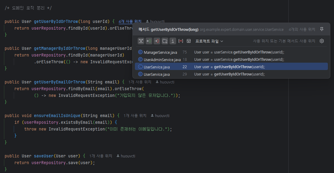 - 도메인 객체가 필요한 서비스들은 더 이상 각자의 Repository를 직접 사용하지 않고, 해당 도메인의 Service에서 제공하는 공통 메서드를 통해 조회 및 예외 처리를 일관되게 수행하도록 한다.