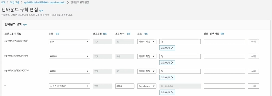 인스턴스 > 보안 > 보안 그룹 > 인바운드 규칙 편집