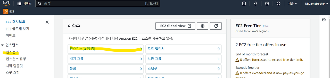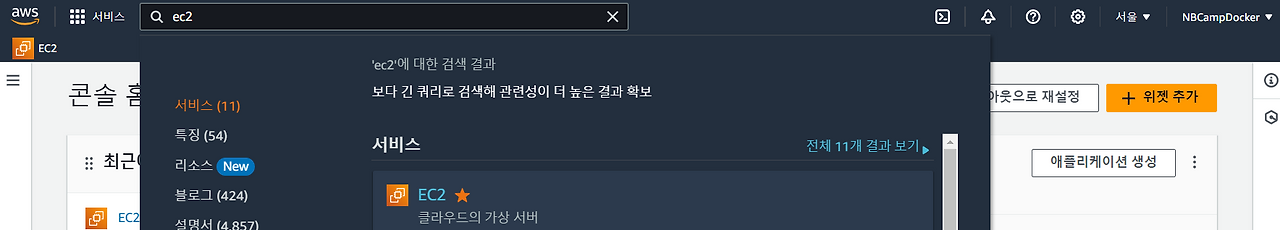 왼쪽 위 검색창에서 ec2 를 입력 후 선택