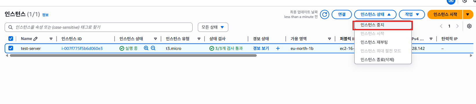 사용하지 않는 EC2 서버는 ‘중지’ 상태로 변경. 서버를 없애려면 위해선 ‘종료’ 선택