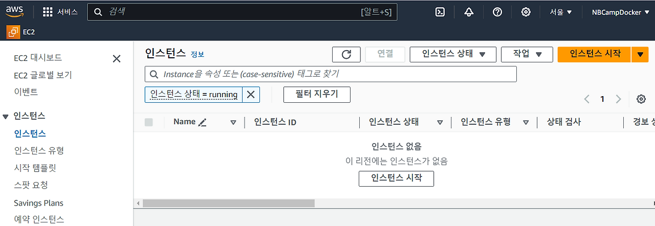 ec2 화면에서 ‘인스턴스’ 를 선택